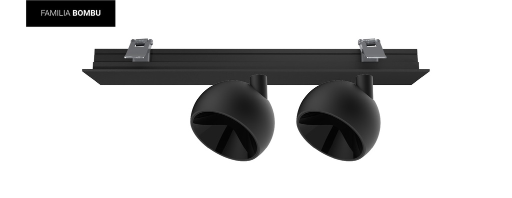 Bombu es una familia de luminarias de interior que combina formas puras y orgánicas ideales para realizar ambientes residenciales, comerciales y hoteleros. Se destaca por brindar un excelente control del deslumbramiento gracias a su fuente de luz profundamente recedida que genera, a primera vista, la sensación de estar apagada. Disponible en dos temperaturas de color: 2700K y 3000K, con dos ángulos: 35° y 50° y dos acabados: blanco y negro